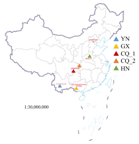 Sampling sites of parasitic flies and Spodoptera. frugiperda in China (Yunnan (YN), Guangxi (GX), Chongqing (CQ_1, CQ-2), and Henan (HN)).