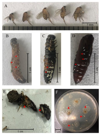 Megaselia scalaris specimens caught in S. frugiperda containers (A), S. frugiperda specimens with several eggs of M. scalaris (B–D), M. scalaris larvae emerging from the S. frugiperda pupa (E), and the medium for S. frugiperda intestinal fungi isolation (F). (A–E) were from Yunnan, and (F) originated in Chongqing. Red arrows indicate the eggs of M. scalaris, red triangles indicate the M. scalaris larvae.