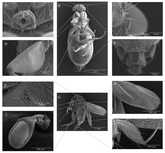 The anesthetized flies were washed by sterilized phosphate buffer saline (PBS) and preserved in 75% ethanol for 24 h. They were then put in a critical point-drier and fixated with double-side adhesive tape, and then coated with gold in vacuum condition. Subsequently, electron microscopy observations were conducted to observe details with regard to the mouthpart, compound eyes, wing, and terminalia for morphological identification with a Hitachi SU3500 Scanning Electron Microscope.