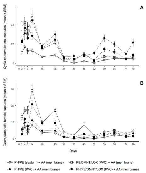 Previous field studies with PE-based lures found that their relative effectiveness in trapping both sexes of the codling moth was variable, and a number of significant factors were identified, including seasonality, trap height and color [,,,,,]. Of particular concern were reports of low female captures in PE-baited traps in some geographical regions [,,,,,,,,,,,]. Gray halobutyl elastomer septa were used as the matrix for PH and PE lures to provide extended effectiveness compared to red rubber septa [,,,,]. A new black PVC proprietary matrix developed for long-lasting mating disruption dispensers has also been developed for a range of insect lures [].