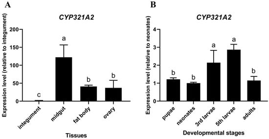 2.5. Analysis of CYP321A2 Expression Level in Different Tissues and Developmental Stages