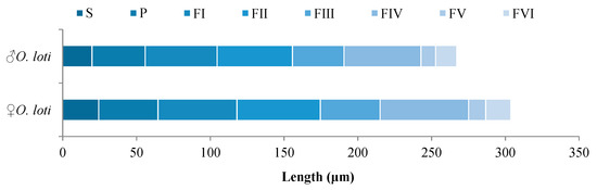 Average length (n = 10) of each antenna segment in O. loti. S: Scape. P: Pedicel. FI-VI: Flagellum I-VI.