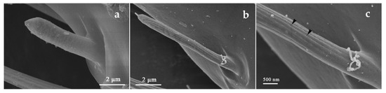 Sensilla chaetica II (SChII) on the flagellum VI. (a) O. loti. (b) S. kaszabi. (c) M. distalis. There is a longitudinal opening at the SChII indicated by the black arrow.