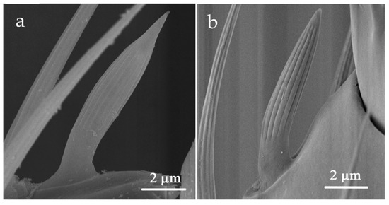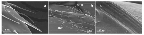 BB exists conservatively in the scape and pedicel of the antenna of many species of insects [15,53,54,55]. It is generally regarded as a mechanoreceptor that senses tension and controls the antenna to swing within a safe range [21]. However, in Thysanoptera, the ultrastructure of Böhm bristle is not reported, and its function has not been verified [28]. Therefore, it is not defined as a functional receptor in this paper. Microtrichia was the most abundant structures on the antenna, also acting as a derivative structure of the cuticular widely distributed on flagellum I-IV [24,27,28].