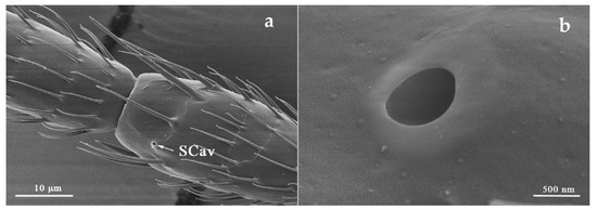 SCav is a cavity-like sensillum with an inward depression in the stratum corneum and often adjacent to SB or SCo. It follows the distribution law of Thermo-hygroreceptors and further confirmed in the ultrastructure of S. dorsalis [28,45]. In this study, the similar sensilla were classified as sensilla cavity and likely functions in the perception of environmental humidity and temperature changes.