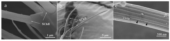 SChII’s distribution was confined on flagellum III-VI. The base of SChII was trapped in a slightly cuticular socket, and there were more arched ridges on the surface with blunt tips than those on SChI (Figure 9). A longitudinal opening in the sensillum made it distinguishable from other ridges (Figure 9c, shown by the black arrow). Moreover, secretions were observed to be attached to it, likely functioning for information exchange (Figure S2).