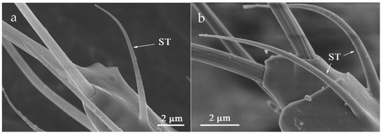 ST was situated on both sides of flagellum VI (Table 2). The slender body is curved in the apex. There is not any cuticular socket and the surface is smooth without holes (Figure 11). The mean length of ST in O. loti was 10.97 ± 0.19 μm in females and 8.27 ± 0.81 μm in males. The ST mean length in M. distalis and S. kaszabi was 15.53 ± 1.26 μm and 9.33 ± 0.99 μm, respectively (Table S2).