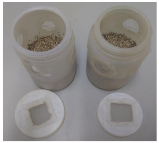Each rearing unit consisted of a plastic cylinder (about 12 cm high × 7.5 cm in diameter; volume ca. 500 mL) with five holes in the wall of the upper half, closed with polyester mesh of 0.2 mm openings, to allow ventilation (Figure 1). Each unit was half filled with vermiculite (maintained in the previous 24 h at 70 °C to kill possible contaminant mites) to increase surface area, promoting better distribution of the mites.