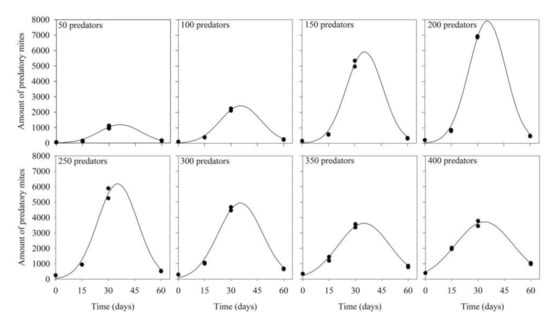 Similar patterns of variation of the numbers of predators with increasing production periods were obtained at all predator inoculation densities (Table 1; Figure 2; R2 ≥ 0.96; p < 0.05). Densities increased with increasing production periods, up to 30–45 days, reducing afterward. Likewise, maximum densities increased with increasing predator inoculation levels, up to 200 predators per rearing unit (when the final estimated number was almost 8000 predators), reducing afterward.