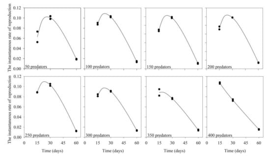 In evaluating the interaction between predator inoculation density and period of production, for each rate of predator inoculation (x), data were subjected to regression analyses, relating either final predator density or instantaneous rate of reproduction (y) in each unit with time of predator production. Regressions were obtained using “curve-fitting” procedure of TableCurve 2D (Systat, San Jose, CA, USA). Among the significant models (p < 0.05), a single one was selected to be used for each rate of predator inoculation. The selection was based on simplicity, parsimony and high F and R2 values. Residual values were also taken into account for each analysis to validate parametric premises.