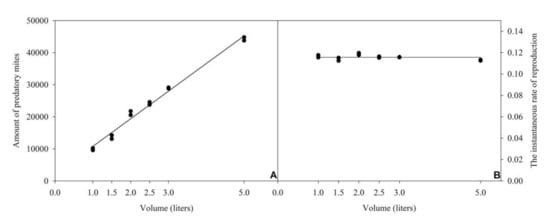 By doing that, a direct and positive relationship was observed between final predator density and volume (y = 8610.25x + 2166.04; R2 = 0.99; p < 0.0001) (Figure 4A). Obtained ri values were rather similar (0.113–0.119) at all evaluated volumes (Figure 4B), so that it was estimated as constant (y = 0.115) within the range of evaluated volumes.