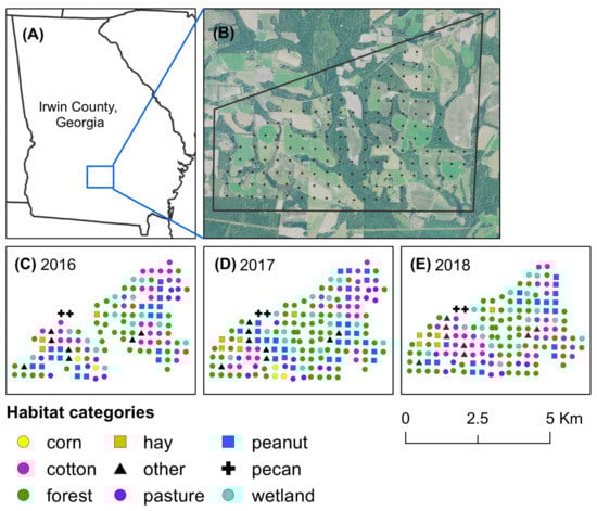 Map of Irwin County, Georgia, USA, and habitat categories at pheromone-baited traps. The study took place in (A) Irwin County, Georgia, where stink bugs were captured across (B) an 18 km2 agricultural landscape. Habitats at each trap site were categorized for (C) 2016, (D) 2017, and (E) 2018, based on predominant land use type.