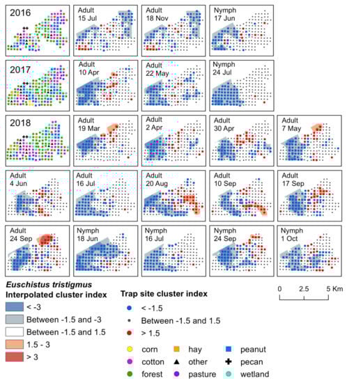 Red–blue plots based on interpolation of the cluster index for E. servus adults and nymphs from 2016–2018. Red areas (>1.5) indicate significant clustering in aggregations in distributions; blue areas (<−1.5) indicate significant clustering as gaps in distribution.