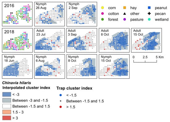 Red−blue plots based on interpolation of the cluster index for C. hilaris adults and nymphs from 2016–2018. Red areas (>1.5) indicate significant clustering in aggregations in distributions; blue areas (<−1.5) indicate significant clustering as gaps in distribution.