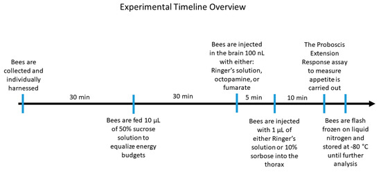 A total of 50 bees were harnessed at one time per treatment. Bees that did not recover from the chill coma were discarded. This was typically less than 5% of the harnessed bees. The order of treatments was randomized to account for seasonal effects. The bees were given 30 min to acclimate to the harness and then were fed 10 µL of 50% sucrose solution to equalize their energy budgets at the start of the experiment [13]. Following the methods of [43], the medial ocelli lens was removed using a microscalpel (Feather, Osaka, Japan) and 100 nL of brain injections were carried out through the ocellar tract using a 30-gauge (BD Precision Glide, Franklin Lakes, NJ, USA) needle and a 10-µL Hamilton Syringe (Reno, NV, USA), placed on a micromanipulator (World Precision Instruments, Friedberg, Germany). The following brain injection treatments were administered: Ringer solution (130 mM of NaCl, 6 mM of KCl, 4 mM of MgCl2, 5 mM of CaCl2, 10 mM of HEPES, 25 mM of glucose, and 160 mM of sucrose) (control), 10 mg/mL of octopamine, and 3 mM of fumarate (a known octopamine synthesis inhibitor). After 10 min, to manipulate the hemolymph trehalose levels, the bees were injected with 1 µL in the thorax with one of the following treatments: Ringer’s solution (160 mM of NaCl, 6 mM of KCl, 8 mM of CaCl2, and 4 mM of MgCl2) (control) or 10% sorbose solution. A treatment of 10% sorbose was used to lower the trehalose levels of forager bees [12]. The harnessed bees underwent a proboscis extension response (PER) assay 5 min after the thorax injections to measure their appetite. This consisted of touching the bee’s antennae with the following ascending concentrations: 0%, 0.1%, 0.3%, 1%, 3%, 10%, and 30% of sucrose solution (w/v). In between concentrations, water was used to desensitize the bee’s antennae. We noted whether the bee extended its proboscis in attempt to feed on the sucrose solution. This is a standardized method for measuring appetite in the honey bee [42]. Immediately after the PER assay, the bees were flash frozen in liquid nitrogen and stored in the −80 °C freezer (Thermo Fisher Scientific, Waltham, MA, USA) until further analysis. The trials were carried out at the same time of day to account for circadian fluctuations in biogenic amine profiles. All chemicals were purchased from Sigma-Aldrich (Merck, Kenilworth, NJ, USA). For a summary of the experimental timeline, please see Figure 1.