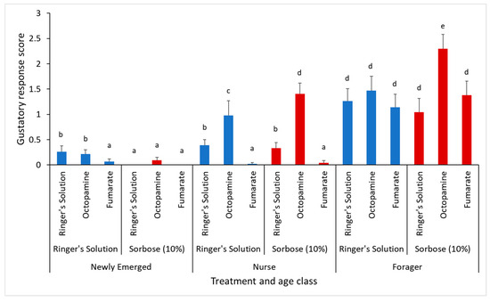 The gustatory response scores (GRS) measuring the appetite of the treated bees across the three age classes (newly emerged, nurse, and foragers). The control bees of each age class are indicated with blue bars and the bees treated with 10% sorbose are indicated in red. Each bar represents the mean GRS, while the error bars represented the standard error. The letters above each bar represent significant differences at the alpha = 0.05 level.