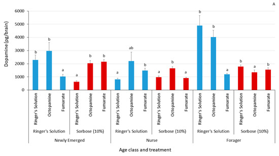 The change in dopamine levels was both age- and treatment-dependent. Newly emerged bees experienced an increase in dopamine from octopamine and fumarate treatments with the 10% sorbose treatment, while fumarate caused a lowering in dopamine in the Ringer’s control group. In nurse bees, there was a lowering in dopamine levels from fumarate relative to the octopamine treated bees within the control group. However, in the 10% sorbose treated group there was an increase only in the octopamine treated bees. The forager bees had lower dopamine levels after fumarate treatment within the control group, and there was also a lowering in dopamine after octopamine and a 10% sorbose treatment (Figure 3A). Fumarate tended to increase serotonin levels in the newly emerged and nurse bees, except for the 10% sorbose-treated bees, while octopamine treatment lowered serotonin levels, but only in the forager bees that were treated with 10% sorbose (Figure 3B). The octopamine injections were successful at elevating octopamine baseline levels across all age classes relative to both the Ringer’s control and the fumarate treated bees (Figure 3C). In newly emerged bees, octopamine injections caused an increase in tyramine for the control group, but a decrease in the 10% sorbose treated group. Fumarate also caused an increase in tyramine levels within the control group and a decrease in the 10% sorbose treated group within the newly emerged bees. In nurse bees, fumarate caused a decrease in tyramine levels within the control group and an increase in the bees treated with 10% sorbose. Octopamine also caused an increase in tyramine levels in the 10% sorbose treated group of nurse bees. Foragers, on the other hand, had no fluctuation in tyramine levels due to any of the treatments administered (Figure 3D). A summary of the statistics can be found in Table 1.