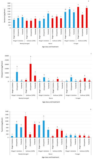 - Schulz, D.J.; Robinson, G.E. Octopamine influences division of labor in honey bee colonies. J. Comp. Physiol. A 2001, 187, 53–61. [Google Scholar] [CrossRef]