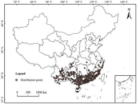 Data processing: The buffer module in the neighborhood analysis of ArcGIS software was used to eliminate the distributed data points to ensure that each grid contains only one distribution point so as to avoid over-fitting caused by too many distribution points. In this study, the spatial resolution of environmental data was 2.5 arc-minutes (about 4.5 km2), and the buffer diameter was 3 km. When the distance between the two distribution points was less than 3 km, only one of the distribution points was retained [26]. The longitude and latitude of each distribution point were determined by Google, and a total of 354 distribution points were obtained (Figure 1).