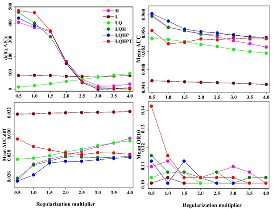 When the default parameters of the MaxEnt model are used to simulate the potential distribution of species, over-fitting can easily occur, and the prediction results may not reflect the actual situation [31]. This problem can be avoided by the adjusting function feature combination (feature combination, FC) and regulated frequency doubling (regularization multiplier, RM). In practice, when using the MaxEnt model to simulate species distribution, most researchers use default parameters. The default parameters of MaxEnt are derived from 226 species [35].