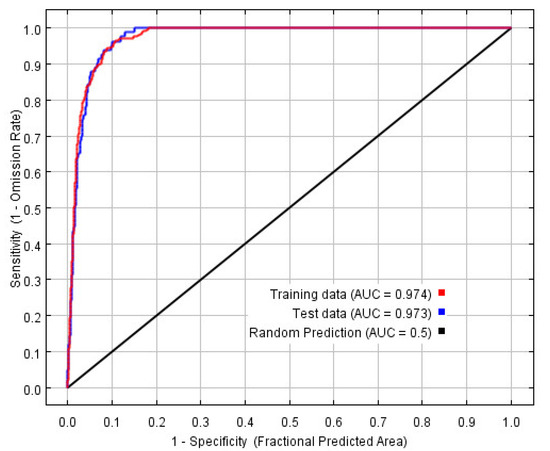 The MaxEnt model was reconstructed based on the optimal combination, and the ROC curve is shown in Figure 3, in which the training AUC is 0.974 and the test AUC is 0.973.