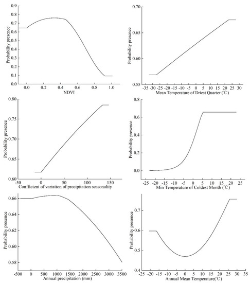 According to the knife-cutting method in the MaxEnt model, only considering the use of a single environmental variable, the six environmental variables that have the greatest influence on the regularization training gain are as follows: annual average temperature, min temperature of coldest month, mean temperature of driest quarter, temperature annual range, annual precipitation, and coefficient of variation of precipitation seasonality (Figure 4). Therefore, in this study, the environmental variables with a contribution rate of more than 10% and the first three environmental variables affected by positive planning training gain were selected as the main environmental variables affecting the distribution of S. invicta, which were the annual mean temperature, minimum temperature of the coldest month, mean temperature of the driest quarter, annual precipitation, coefficient of variation of the precipitation seasonality, and NDVI.