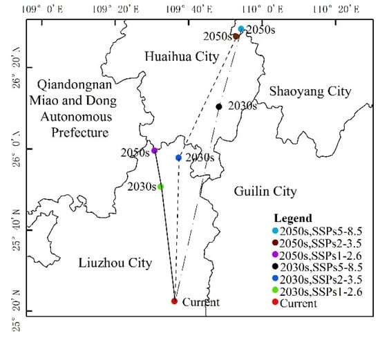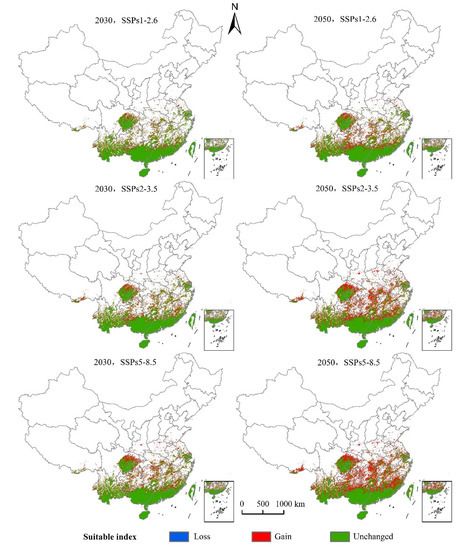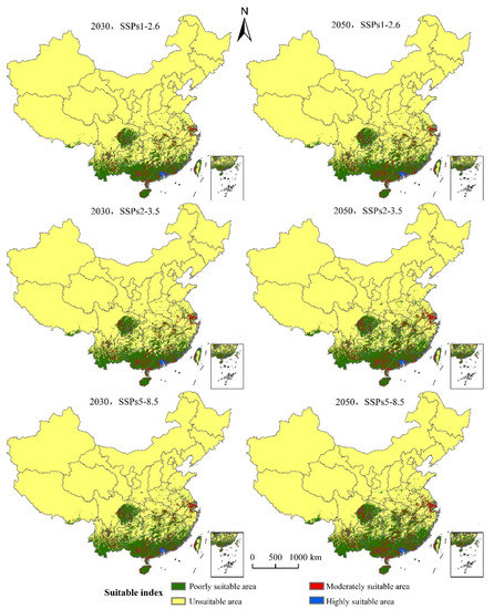 (1) The SSPs1-2.6 scenario: The distribution center latitude increased by about 0.47°, the suitable area increased by 19.32 × 104 km2, the decreased area was 0.08 × 104 km2, and the maximum proportion of stable area was 72.96 × 104 km2. The suitable areas mainly appear in northern Guangxi, northern Guangdong, and eastern Sichuan Province. Yunnan, Guizhou, Hunan, Jiangxi, and Fujian Province have fragmentary distribution. Hubei, Anhui, Zhejiang, Jiangsu, Henan, southern Tibet Autonomous Region, southern Shandong, and southern Shaanxi Province all displayed a small distribution.