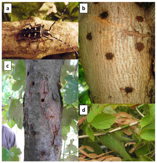 Main symptoms of A. glabripennis infestation: presence of adults (a), adult exit holes (b), oviposition scars (c), maturation feedings on twigs (d).