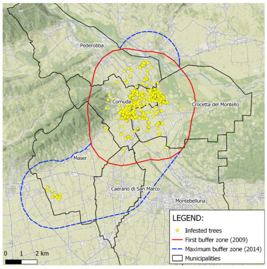 After the checking of all host plants growing in the area, the infested and buffer zones were established (Figure 2). The “infested zone” consisted of a polygon including all the infested plants, where the vertices of the polygon were the more external infected plants. The infested zone was included in the territory of six municipalities (Cornuda, Pederobba, Crocetta del Montello, Maser, Montebelluna and Caerano di San Marco). Then, a “buffer zone” was established with a radius of 2 km around the infested zone, i.e., around the most external infested trees, according to European regulations [34]. Year-by-year, when new infested trees were found, the delimited zones (infested and buffer zones) were officially extended (or restricted) several times, coming to also include the bordering municipalities where satellite infestations have been discovered since 2010.