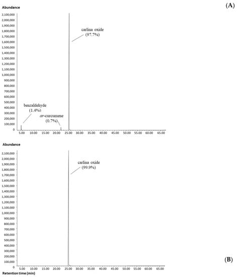 This chemical profile overlapped with those of our previous studies [,,,]. The chromatographic procedure allowed us to increase the purity of the carlina oxide to 99.9% (Figure 1B).