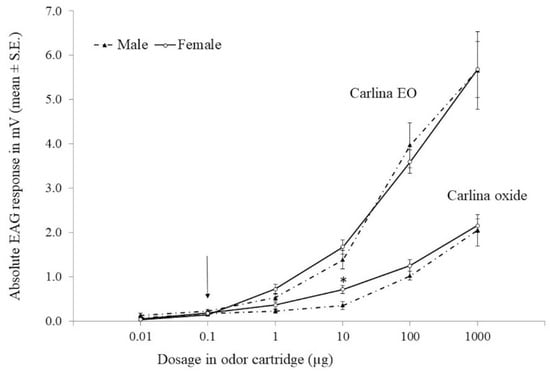 Electroantennogram dose-response curves of Bactrocera oleae males and females (n = 5) to Carlina acaulis essential oil (EO) and its main component, carlina oxide. The arrow indicates the activation thresholds. The asterisk indicates significant differences between male and female EAG responses to carlina oxide at p = 0.05 (t-test for independent samples).