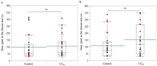Time spent in the chosen arm by (A) males and (B) females of Bactrocera oleae in Y-tube experiments assessing the tephritid behavioral responses to carlina oxide formulated at its ingestion LC90. Red boxplots indicate the median (solid line) within each box and the range of dispersion (lower and upper quartiles and outliers). Means and standard errors are represented by green lines and blue T-bars, respectively. Above the boxplots, ns indicates no significant difference with the control (Wilcoxon test, p > 0.05).