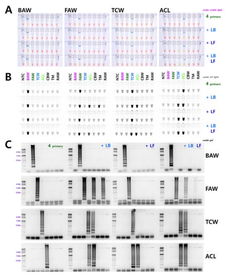 In addition to the four essential primers selected (F3, B3, FIP, and BIP), we verified whether the use of additional loop primers could increase the reaction efficiency by adding each loop primer individually (LB or LF) and both primers simultaneously (LB and LF). This resulted in non-specific reactions except in the case of BAW, in which primer addition increased the reaction efficiency. In particular, the reaction efficiency was significantly improved when the two loop primers were added and reacted simultaneously. A representative electrophoresis image is shown in Figure 2C. Contrary to BAW, non-specific reactions occurred with loop primer addition in FAW, TCW, and ACL, and most of these occurred in TCW and ACL, which have high nucleotide sequence homology (Figure 2). A non-specific reaction occurred in a species belonging to another genus with low sequence homology. When LB was added to FAW, the reaction indicated another genus, Agrotis segetum. We examined more than five replicates (biological replicates using gDNA samples from various local populations) for this result, and gel electrophoresis results were similar except for slight differences in intensity.