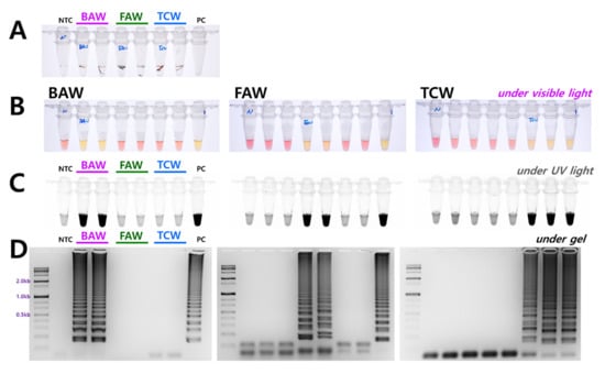 The diagnostic concentrations were sequentially decreased by 1/10 from 100 ng to 100 fg in a 25 µL standard reaction solution for four species. The results indicated that BAW was detected up to 1 ng, FAW up to 1 pg, and TCW and ACL were detected up to 10 pg concentrations (Figure 3). Although the diagnostic limit concentration was different in the 1 h equivalent, the reaction was conducted. These standards are based on the electrophoresis results; the diagnostic limit concentration could, thus, be somewhat higher by visual observation or upon confirmation after UV treatment. The reaction proceeds smoothly at various concentrations despite differences between species. Therefore, a method was developed without a separate DNA extraction process that could be combined with the LAMP method. A part of the antenna or leg tissue from BAW, FAW, and TCW adults or larvae was cut and reacted at 95 °C for 5 min to release DNA, similar to the method reported previously for FAW []. By measuring the amount of released DNA using a nanodrop system, the DNA concentration was found to be at least 1 ng or more, even though the concentration differed depending on the amount of tissue in the initial reaction. Overall, sufficient DNA was released for the reaction, and showed the same results as the positive control (DNA extracted using DNAzol) for BAW, FAW, and TCW (Figure 4).