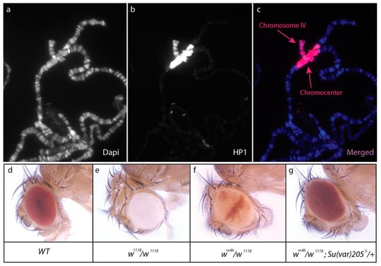 Heterochromatin represses neighboring genes. (a–c): HP1a immunostaining of salivary gland polytene chromosomes reveals the heterochromatic nature of chromosome IV and the chromocenter. DNA is stained with DAPI (in blue). (d–g): Position effect variegation of white (w) and the effect of a mutation in Su(var)205. Wild-type flies have red eyes (d), whereas flies carrying a loss of function mutation of w (w1118) have white eyes (e). The wm4h inversion relocates w close to the pericentromeric heterochromatin; silencing of w by the stochastic spreading of heterochromatin leads to a mosaic phenotype (f). Mutation in Su(var)205 encoding HP1a dominantly suppresses this variegation (g).