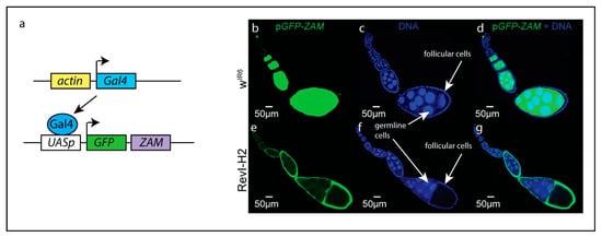 Regulation of the retrotransposon ZAM by piRNAs. (a): Principle of the ZAM sensor. Expression of the trans-activator Gal4 is ubiquitously driven by actin regulatory sequences. The GFP coding sequence is fused to a fragment of the ZAM env region and placed under the control of UAS sequences and a minimal promoter. (b–g): Expression of the ZAM sensor in ovaries of control flies (wIR6) or in flies with a deletion in flamenco and a de novo insertion of ZAM in a pre-existing dual strand cluster (RevI-H2) (b,d,e,g). In wIR6, the sensor is silenced by the uni-strand piRNA cluster flamenco in somatic follicular cells and expressed in the germline (b,d). On the opposite, in RevI-H2, the sensor is expressed in the somatic follicular cells due to the mutation in flamenco and silenced in the germline due to the ZAM insertion in the dual strand cluster (e,g). Origin of the photographs: Courtesy of Emilie Brasset [45] (http://creativecommons.org/licenses/by/4.0/ accessed 2 September 2021). In blue: Staining of DNA with DAPI. In green: GFP-ZAM.