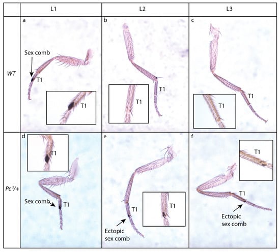 PcG mutations induce ectopic expression of Hox genes and a change of segment identity leading to homeotic phenotypes. The name of many PcG genes relates to these homeotic phenotypes (i.e., polyhomeotic, pleiohomeotic) or to the presence of ectopic sex combs. Sex combs are organs made of modified bristles normally present on the first tarsal segments of the most anterior pair of legs in males (Figure 3a–c). Ectopic sex combs are frequently observed in Drosophila males that are mutant for PcG (i.e., Polycomb, Polycomb-like, Posterior sex combs, extra sexcombs, Sex combs extra, super sex combs, multi sex combs, etc.) (Figure 3d–f). This is caused by ectopic expression of the Hox gene Sex combs reduced [50]. Sequencing of Polycomb revealed the existence of a chromatin-addressing domain shared with HP1 [51], named chromodomain (for chromatin organization modifier), and Polycomb (PC) was further shown to be involved in chromatin packaging [52].
