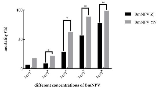 A comparison of the pathogenicities of different concentrations of the two BmNPV strains against Baiyu larvae. Note: “*” represents p < 0.05; “**” represents p < 0.01.