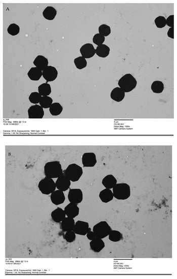 Morphological observation of BmNPV polyhedra by electron microscopy (×1500): (A) BmNPV ZJ and (B) BmNPV YN.