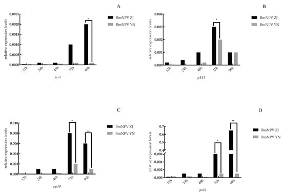 The relative expression of genes of the two BmNPV strains in the midgut of Baiyu larvae: (A) ie-1; (B) p143; (C) vp39; (D) polh. Note: “*” represents p < 0.05; “**” represents p < 0.01.