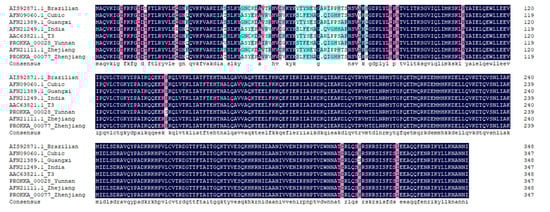 The nucleotide sequences of the BmNPV ZJ and BmNPV YN genomes were analyzed by DNAMAN software (https://www.lynnon.com/dnaman.html accessed on 26 September 2021). The genes of BmNPV ZJ and BmNPV YN were 92.6–100.0% homologous. A comparison with the genome sequences of the other six BmNPV reference strains showed homologies of BmNPV ZJ and BmNPV YN in the range of 92.0–100.0% and 93.3–100.0%, respectively (Table S1). The bro-d gene sequence of BmNPV ZJ and BmNPV YN showed 95.9% homology, and the homologies with the other BmNPV reference strains were 92.1–99.6% and 93.3–97.3%, respectively (Table 5). The amino acid sequence homology of the BRO-D (encoded by the bro-d) of BmNPV ZJ and BmNPV YN was 96.6%, and the homologies with other BmNPVs were 92.0–99.7% and 92.2–97.1%, respectively (Table 5). The amino acid of the BRO-D protein of the two strains was mainly mutated at the N-terminal (Figure 4), which was consistent with the observation of Zhou et al. [26].