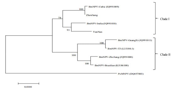 The bro-d gene was chosen for the evolutionary analysis of the two BmNPVs. Using Plutella xylostella multiple nucleopolyhedrovirus (PxMNPV) as the exogenous reference, the phylogenetic tree was plotted using the MEGA 7.1 software (https://megasoftware.net/ accessed on 26 September 2021). The results are shown in Figure 5. The eight BmNPV strains were divided into two clades. Both BmNPV ZJ (Zhenjiang) and BmNPV YN (Yunnan) were grouped in clade I, and BmNPV ZJ was closer to the Cubic strain (IQ991009) while BmNPV YN was closer to the India strain (JQ991010). These finding are similar to those reported by Tang et al. [12].