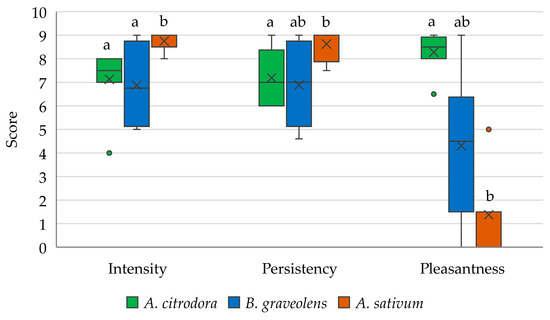 Scores attributed by the expert panel to the main hedonic parameters describing the Aloysia citrodora, Bursera graveolens, and Allium sativum essential oils (EOs). The box plots show the distribution of scores from the 25th to the 75th percentile. In each box, the middle line represents the median value, the x represents the mean value, the upper and lower vertical lines represent the maximum and minimum values, respectively, and the filled circles represent the outliers. Different letters indicate significant differences according to Dunn-Bonferroni pairwise comparisons test (p ≤ 0.05).