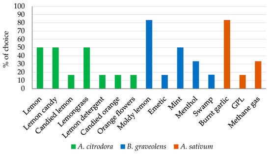 Figure 2 lists the specific descriptors used by the eight panellists to describe the three EOs during the olfactory tests, together with their percentage of choice. The three tested EOs showed very different olfactory profiles. Among them, the smell of the A. citrodora EO was described by all panel experts as citrusy and floral, thus indicating its high odour complexity. The very low pleasantness score attributed to the A. sativum EO can be easily explained by the high number of off-flavours mentioned by the panellists to describe its smell.