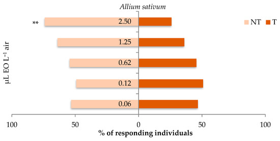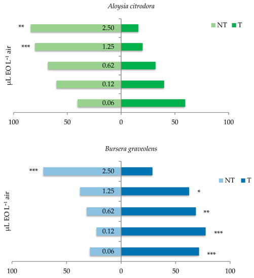 Behavioural response of the C. vomitoria adults in the presence of Aloysia citrodora, Bursera graveolens, and Allium sativum essential oils. NT, % of insects that chose the control chamber; T, % of insects that chose the EO-treated chamber. Asterisks indicate the significant effect of the EOs on the ratio of the adults choosing either the control or the EO-treated chamber (χ2 test; * p < 0.05; ** p < 0.01; *** p < 0.001).