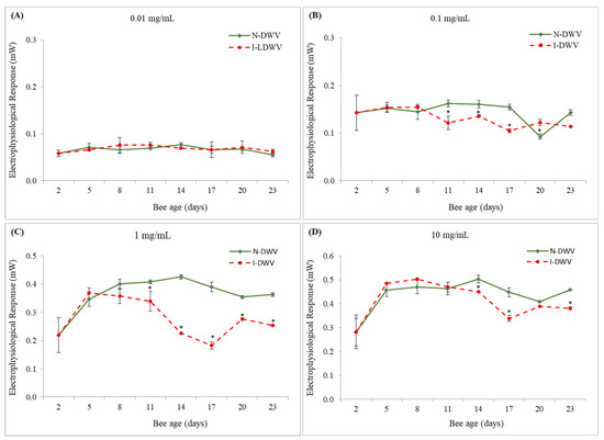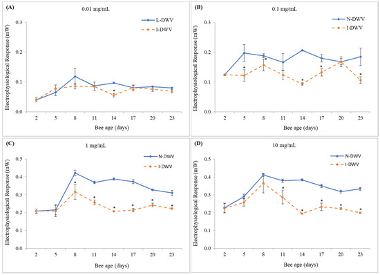Electrophysiological response of inoculated and non-inoculated worker bees exposed to essential oil of Mentha piperita. Uppercase letter in each subfigure represent the essential oil at concentration of (A) 0.01, (B) 0.1, (C) 1.0 and (D) 10.0 mg/mL. Asterisks indicate significant differences for the same sampling time in bees that were inoculated (I-DWV) and non-inoculated (N-DWV) with DWV-A, according to the Bonferroni test (p < 0.05). The bar in each age indicates standard error.