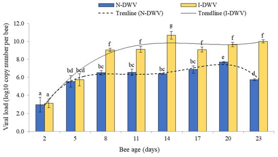 Statistical differences in the viral loads in honey bees according to (1) viral status (non-inoculated bees collected from frames that were detected with a basal low level of DWV-A (N-DWV) and those that were additionally inoculated with DWV-A (I-DWV)) and (2) bee ages (honey bees 2 to 23 days old) were estimated by Factorial ANOVA. Tukey’s HSD test (p < 0.05) was then used to separate means between treatments.
