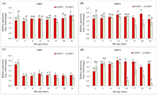 Gene expression of OBPs in worker honey bees of different ages and that were inoculated (I-DWV) and non-inoculated (N-DWV) with DWV-A. Means (±SE) with different letters indicate significant differences according to the Bonferroni test (p < 0.05) in (A) OBP2, (B) OBP11, (C) OBP5 and (D) OBP12.