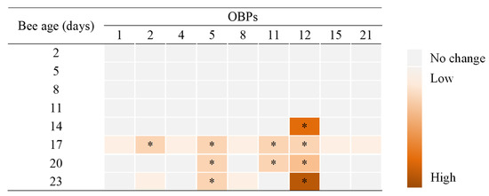 Heat-map illustrating the intensity of down-regulation of odorant binding proteins (OBPs) in the antennae of worker honey bees of different ages that were inoculated with DWV-A. Asterisks indicate significant differences (Bonferroni test, p < 0.05). Gene expression of OBPs in antennae of inoculated bees with DWV-A compared to non-inoculated bees.