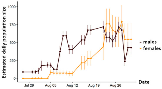 We observed distinct protandry. Thus, the first males were observed one week before the first females; they showed a strong increase from 7 August 2019 onwards (Figure 1). The first females were marked 5 August 2019; after two weeks of parallel development to males, they exceeded the daily numbers of males on 23 August 2019. The highest estimates were obtained for males and females on 27 and 28 August 2019, respectively.